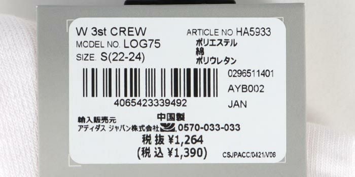 アディダス adidas スリーストライプ レディース クルーソックス LOG75 HA5933 ホワイト/ブラック