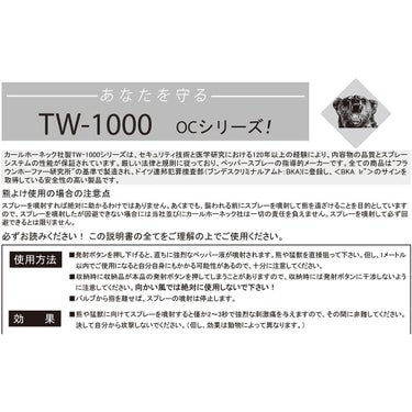ドイツ製・熊よけペッパースプレー TW-1000 SERIESドイツ・カールホーネック社製 TW1000シリーズは 30年以上の研究実績があり、厳しい法律と規則に従っている、ペッパースプレーの指導的メーカーです。全ての商品は、「フラウンホーファー研究所」の基準で製造され、ドイツ連邦犯罪捜査部(ブンデスクリミナルアトム:BKA)に登録し、<BKA 1r”>のサインを取得している安全性の高い製品です。ドイツはもちろん、スイス・フランス・オーストリアでも、長きに渡って使用されているペッパースプレー(熊よけスプレー)です。【OC】オー・シーOleoresinCapsicum(オレオレシン・カプシウム)の略。唐辛子などから抽出する辛味成分。効果が強く即効性があり動物全般に使用可能。自然由来の植物性成分であり微生物分解性なので環境への影響がない。
