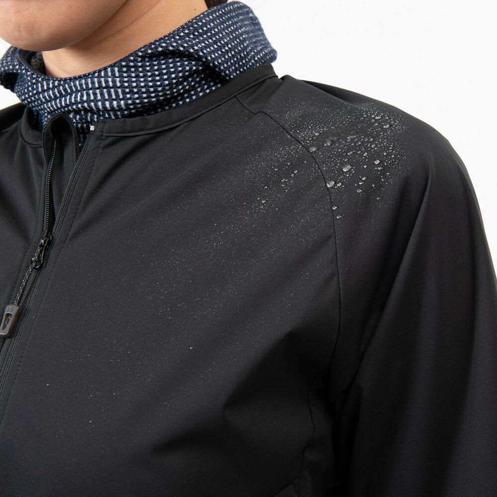 レイヤリングは単に衣類を重ねて着るだけでなく、個々の層で発揮すべき特性に注目して素材や構造を選ぶことで機能を発揮できます。身体に近い1枚目は肌に汗を残さない素材のものを選び、2枚目は汗を吸い上げて拡散させながら蒸発させる働きを備えたものを重ねることになります。2枚目で蒸気になった汗を外気に放出するのが上着(アウタージャケット)の役目です。スキーの場合、シェルジャケットやメンブレンの入っている中綿入りジャケットがそれにあたります。また、汗は放出しても、雪や雨はさえぎりたい。こうした相反する機能を実現するのが、湿気だけ通して水は通さない「防水透湿性」です。防水透湿性をフルに発揮させるためにはレイヤリングが不可欠だと言えます。